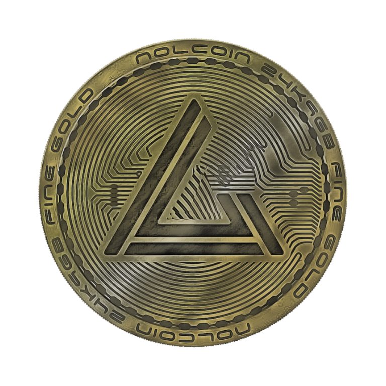 A tangible gold bullion token coin embossed with digital elements to give it a modern cryptocurrency appeal. Inset is the illuminating emblem consisting of the alphabet character 'L' carved from a 60 degree triangle.
